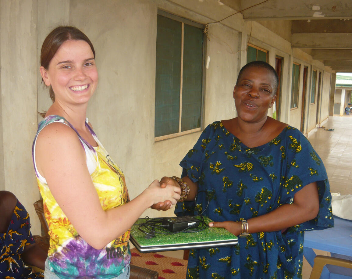 Eens per jaar reist een bestuurslid af naar Ghana. We kunnen dan in beperkte mate materialen meenemen. Zo maakten we de community eerder blij met een aantal gedoneerde laptops, tas vol tandpasta en voetbalschoenen en -outfits.